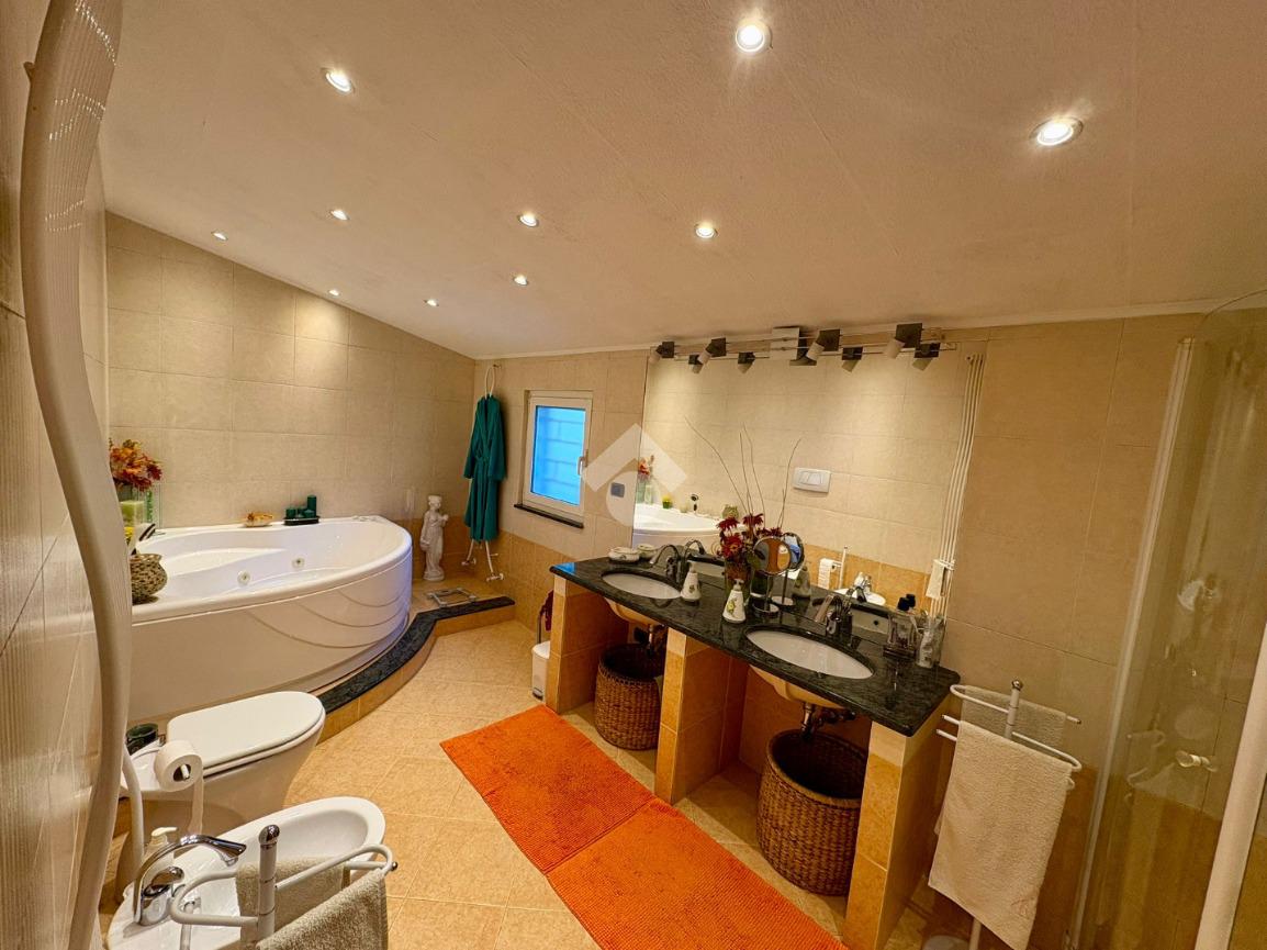 Al piano inferiore, la zona giorno accoglie con un ampio salone, una cucina spaziosa, ideale per momenti di convivialità e il primo bagno.